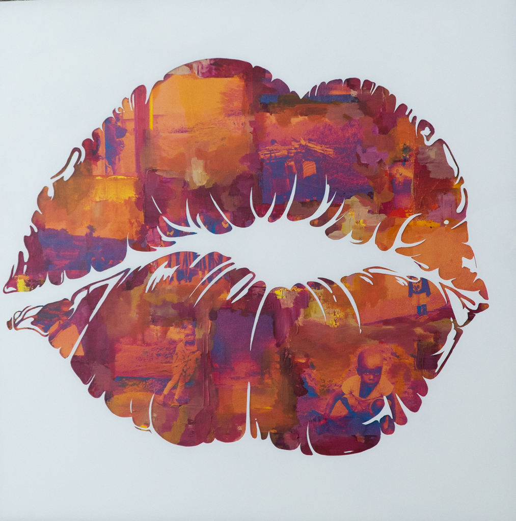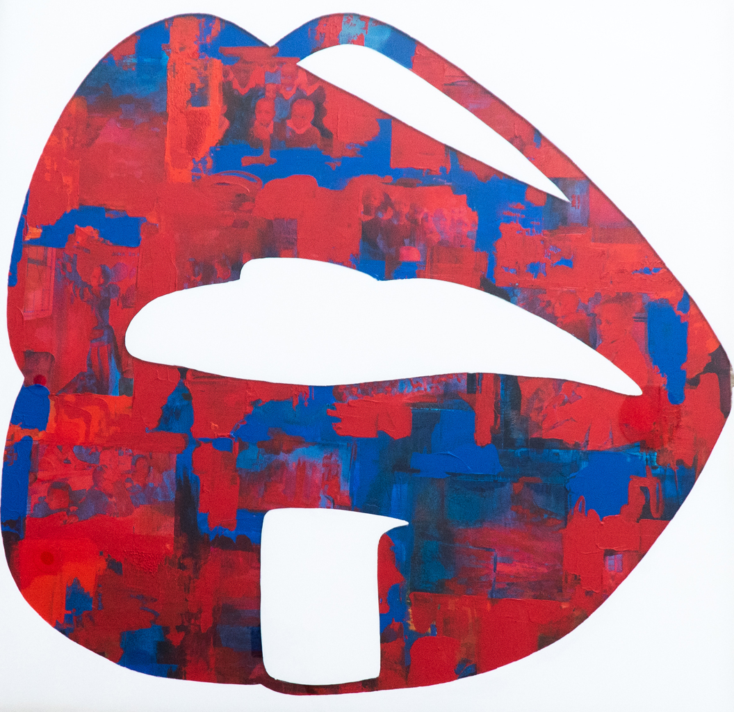 The paintings on plexiglass, “art filters”, have paintings of lips representing a selfie pucker. The lips are painted backwards, leaving a free space (the shape itself) to see through the colored canvas behind it.