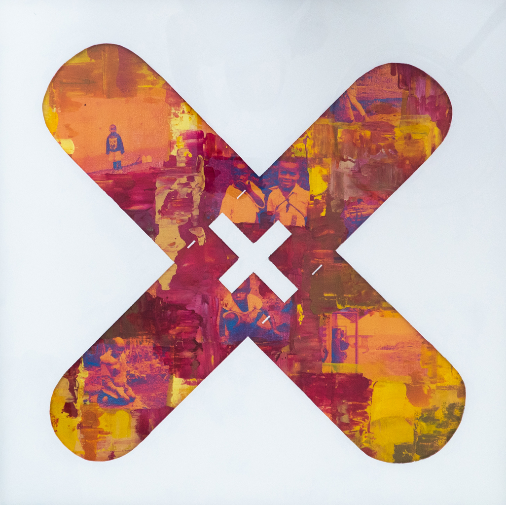 Each work of art consists of two parts: a painting on canvas and a painting on plexiglass that covers the canvas.
