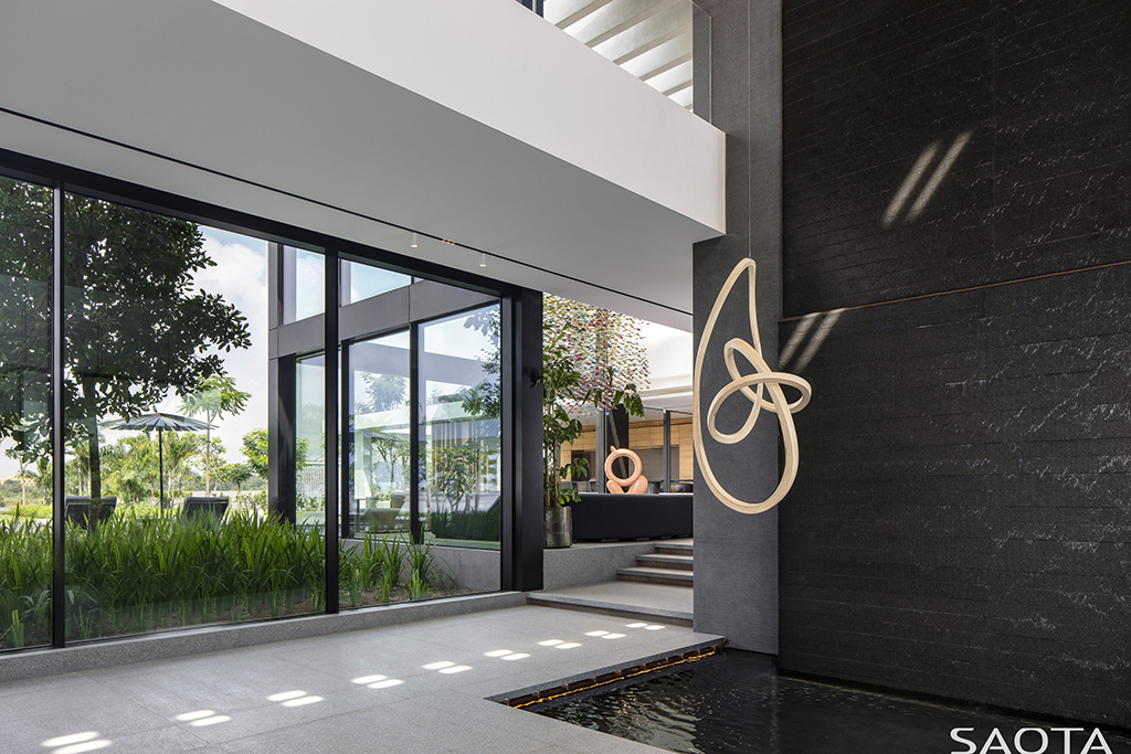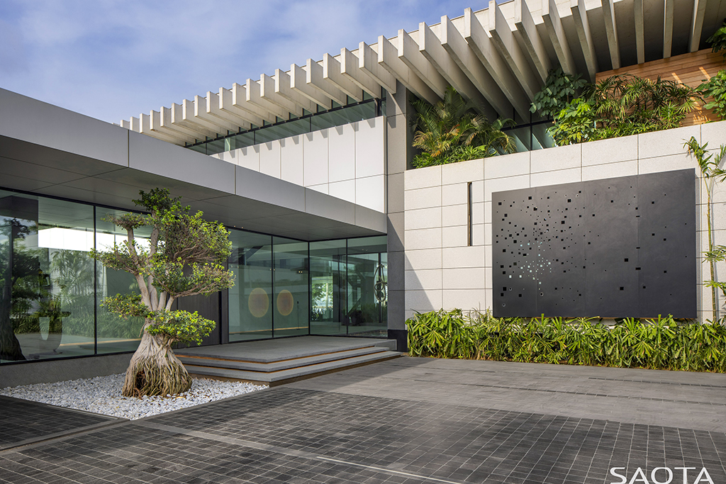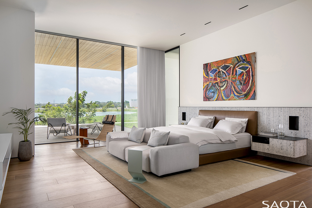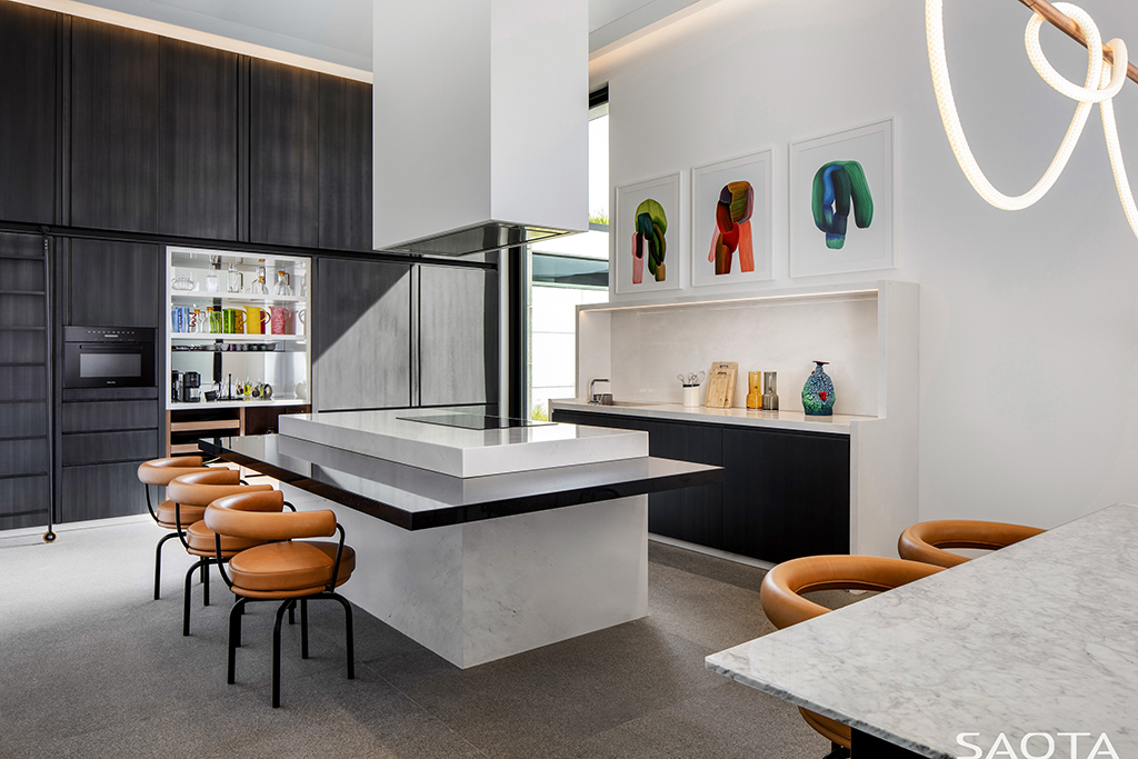 One of the most distinctive aspects of the villa is the permeable roof, composed of exposed concrete beams and skylights that filter natural light, creating an effect similar to the sun’s rays passing through the foliage of the trees. This solution, combined with the terraced courtyards, helps to dissolve the separation between indoor and outdoor spaces, underlining SAOTA’s approach, which has always been oriented towards the harmonious integration between architecture and landscape. The inclusion of the villa in a garden with an almost park-like setting further strengthens this relationship.