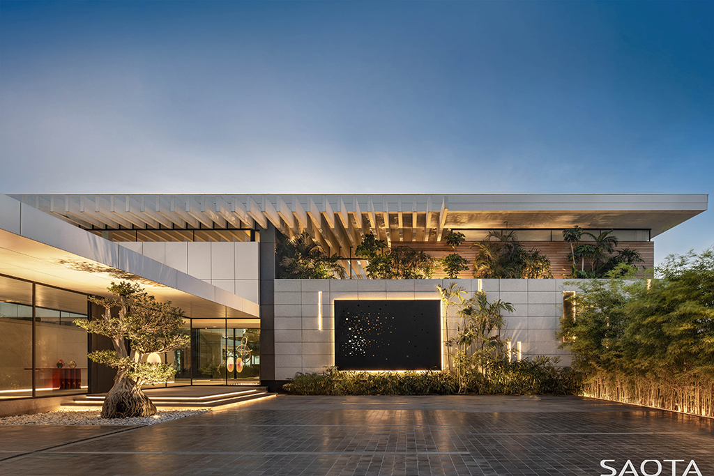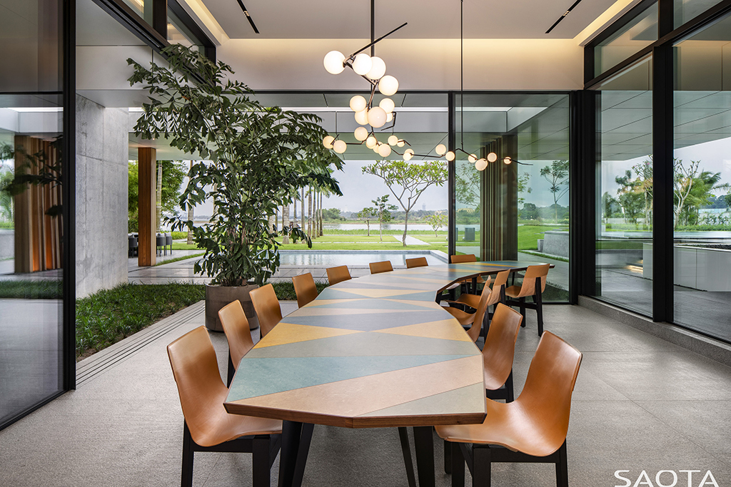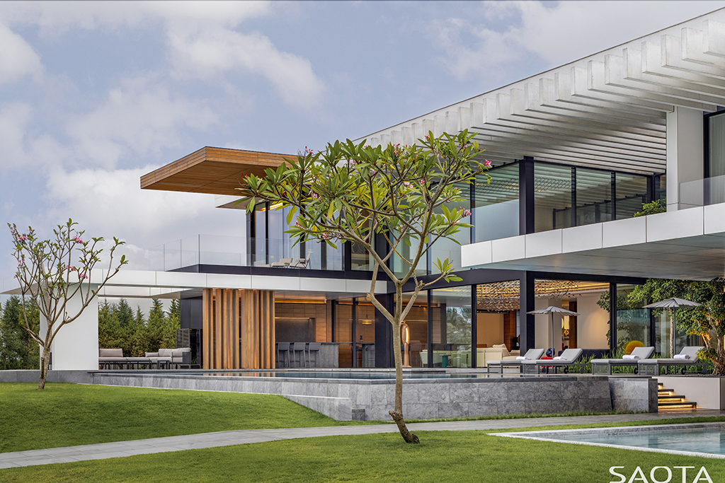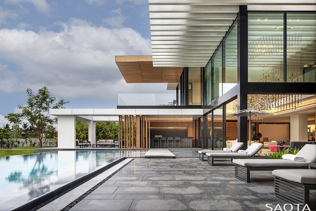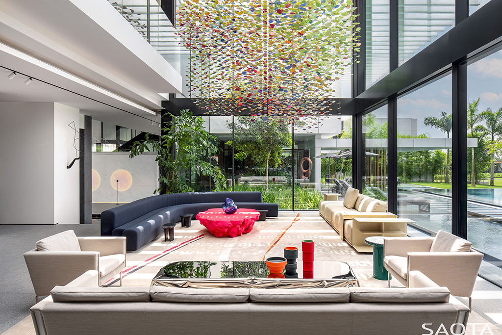 One of the most distinctive aspects of the villa is the permeable roof, composed of exposed concrete beams and skylights that filter natural light, creating an effect similar to the sun’s rays passing through the foliage of the trees. This solution, combined with the terraced courtyards, helps to dissolve the separation between indoor and outdoor spaces, underlining SAOTA’s approach, which has always been oriented towards the harmonious integration between architecture and landscape. The inclusion of the villa in a garden with an almost park-like setting further strengthens this relationship.