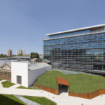 Quest’ultimo fronte, in particolare, ha una storia progettuale a sé stante legata alle caratteristiche del fronte originario caratterizzato da alti muri in cemento armato prefabbricato, che il Comune richiedeva di conservare nel loro aspetto ma anche nella loro mediocrità. “Con queste premesse c’era il serio pericolo di compromettere l’esito architettonico dell’intero progetto e quindi abbiamo deciso di creare qualcosa di speciale”, spiega Tortato. Gli alti muri sono rimasti, ma dopo “la cura” si presentano come una sorta di codice a barre in calcestruzzo con toni variabili di grigio, caratterizzati dall’inclusione di cubi di vetro pieno passante di dimensioni differenti, progettati in collaborazione con la ditta Seves, leader della produzione di vetrocemento, che ha collaborato con i più noti architetti internazionali nello sviluppo di pezzi speciali su misura.