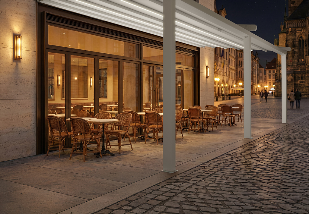 Un ulteriore elemento tecnico rilevante è rappresentato dalla grondaia integrata con deflusso interno ai montanti. Questa soluzione consente una gestione efficiente delle acque, evitando ristagni e contribuendo alla conservazione delle prestazioni nel tempo. L’integrazione di chiusure laterali incrementa ulteriormente l’efficienza del sistema, migliorando la protezione perimetrale e favorendo il controllo del microclima nello spazio coperto.