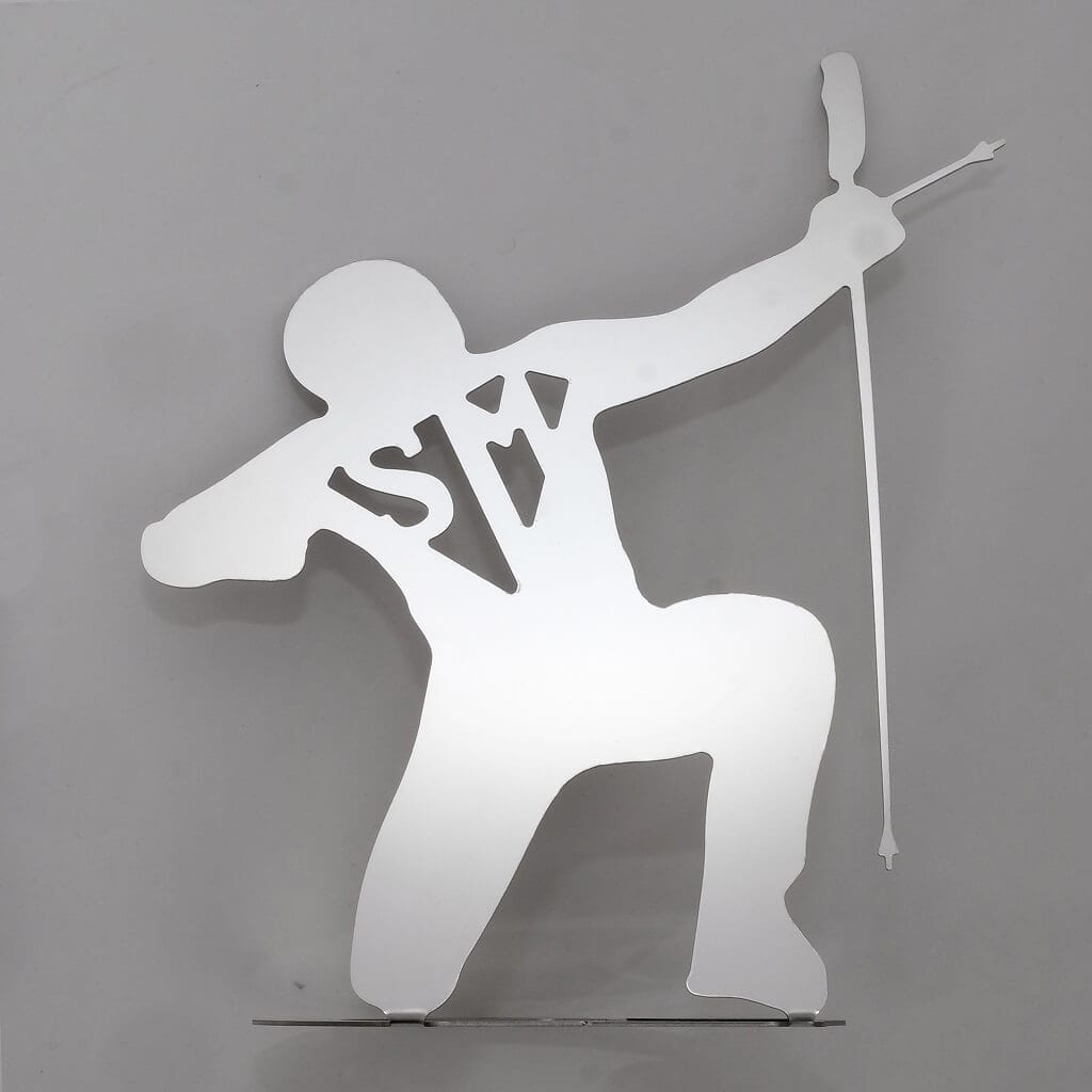E’ nata così un’opera che trasforma “Super Max”, nella posa dell’Arciere, in un simbolo non solo di vittoria a fine gara, ma anche di forza e determinazione di “chi non molla mai”. Consapevole che la vittoria si costruisce un passo dopo l’altro. In cui la freccia è metafora per andare oltre le difficoltà, nella direzione scelta. Oltre i propri limiti, verso nuove sfide, con coraggio e dignità. Trasformando la spinta alla sopravvivenza in desiderio e ricerca di un mondo migliore.