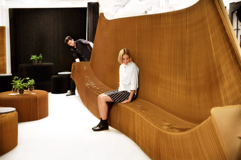 benchwall begins with a flexible and expandable 18 tall seat that extends into a 6 tall back. Made from continuous sheets of paper honeycombed together, benchwall presents a unique combination of durability, flexibility, and privacy. The backrest of the bench, the strength of which is belied by the chairs humble paper material, is surprisingly comfortable. […]