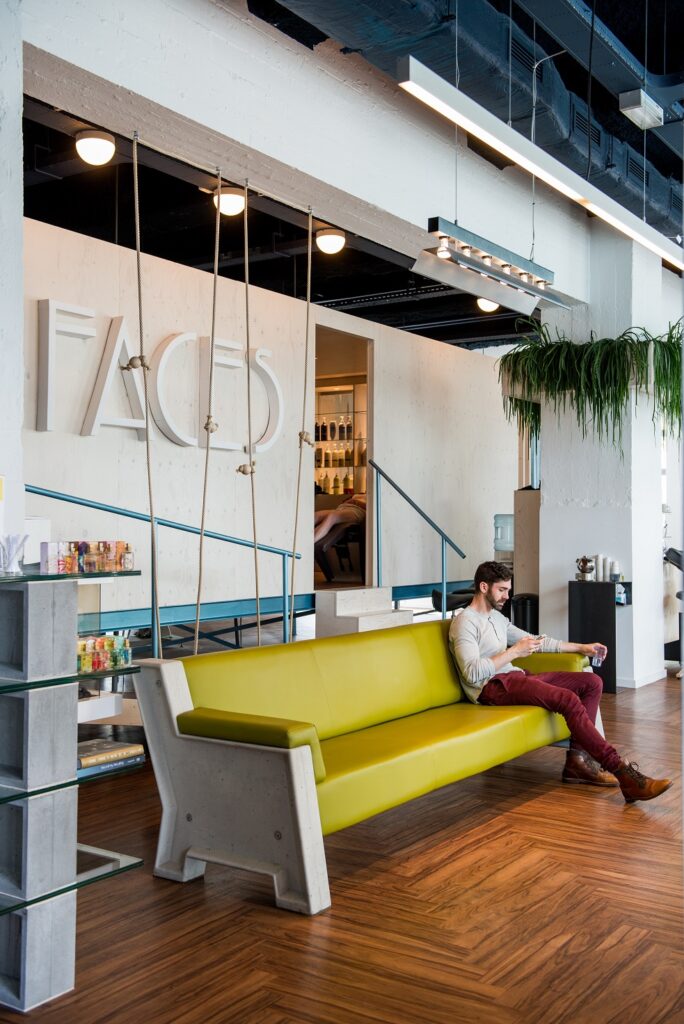 Concrete sofa special edition: 3 meters long in olive coloured leather. We also added a Bulb TL. Located at Faces kappers in Eindhoven.