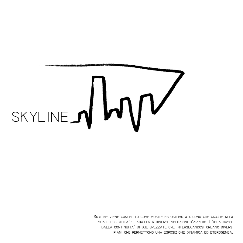 Skyline viene concepito come mobile espositivo a giorno che grazie alla sua flessibilita’ si adatta a diverse soluzioni d’arredo. L’idea nasce dalla continuita’ di due spezzate che intersecandosi creano diversi piani che permettono una esposizione dinamica ed eterogenea.