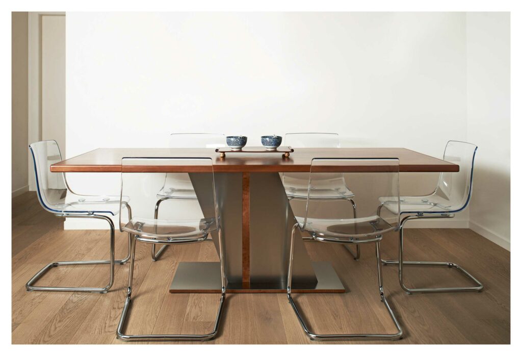 PIUMA Tavolo Size: L 2170 W 930 H 770 mm Materials: Piano in piuma di noce base in acciaio inox satinato inserti in piuma di noce Tavolo da giorno dalle linee nette e decise, nato dal riutilizzo di un vecchio pannello in piuma di noce sorretto da una base rivestita in acciaio e legno posizionata […]