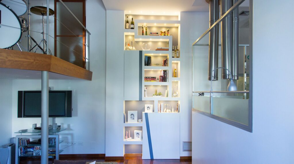PW Parete attrezzata Size: L 1360 W 220 H 3560 mm Materials: ante in legno laccato opaco bianco | struttura in cartongesso verniciato bianco con smalto ad acqua Wall system in cartongesso, i cui spessi profili emergono dalla parete di fondo grigia richiamata dai tagli delle ante in legno, in una complessiva alternanza di pieni […]
