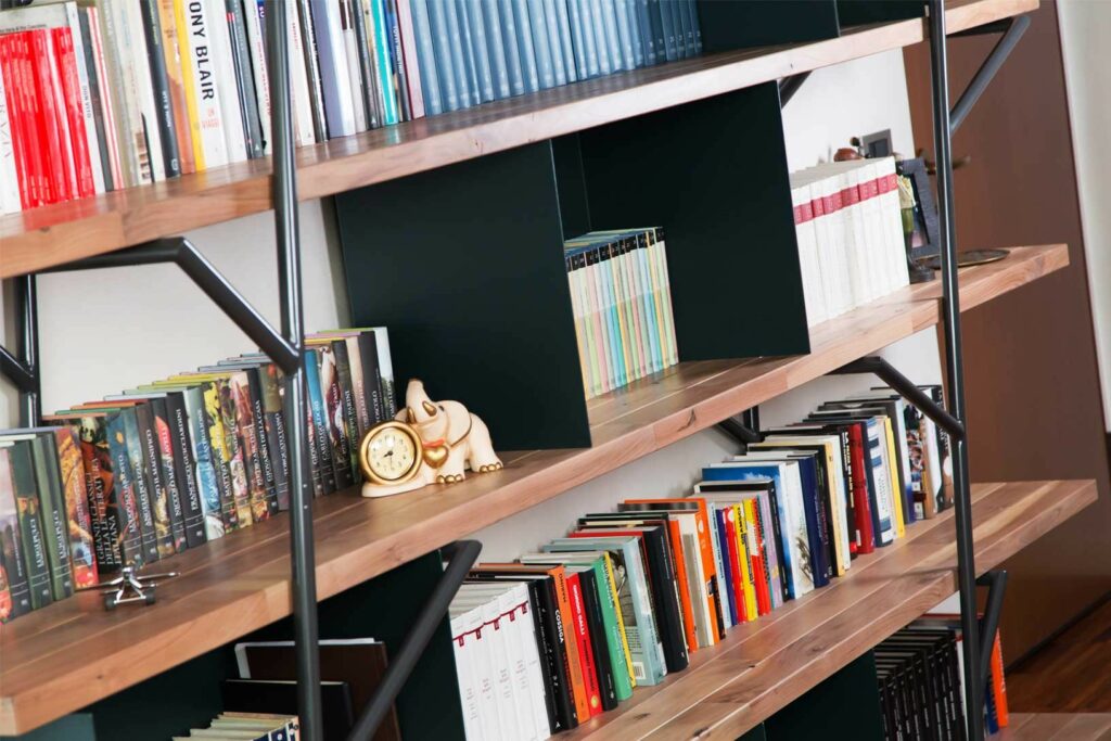 LOGSHELF libreria Materials: Massello di noce canaletto | Acciaio verniciato | lamiera di ferro verniciata Realizzata con telai in acciaio verniciati le cui ramificazioni fungono da supporti per i mensoloni in legno. Vani a giorno in lamiera di ferro si posizionano tra le mensole. Gli scatolari metallici, orientati e sagomanti abbracciano e bloccano i piani […]