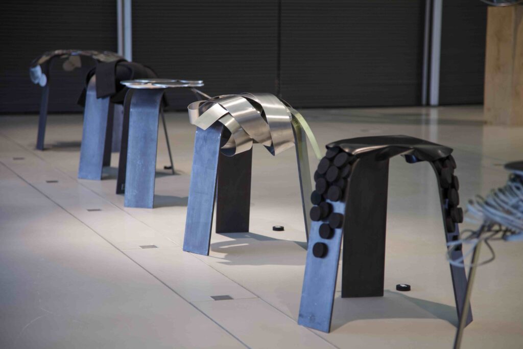 I’ve designed and created those stools. All of them have been built with the same base in metal, and then I worked them like a sculpture with different materials like stainless steal, EPDM, etc. Each stool is numbered and can be sold separately. High stools and other models are also available. For more informations do […]