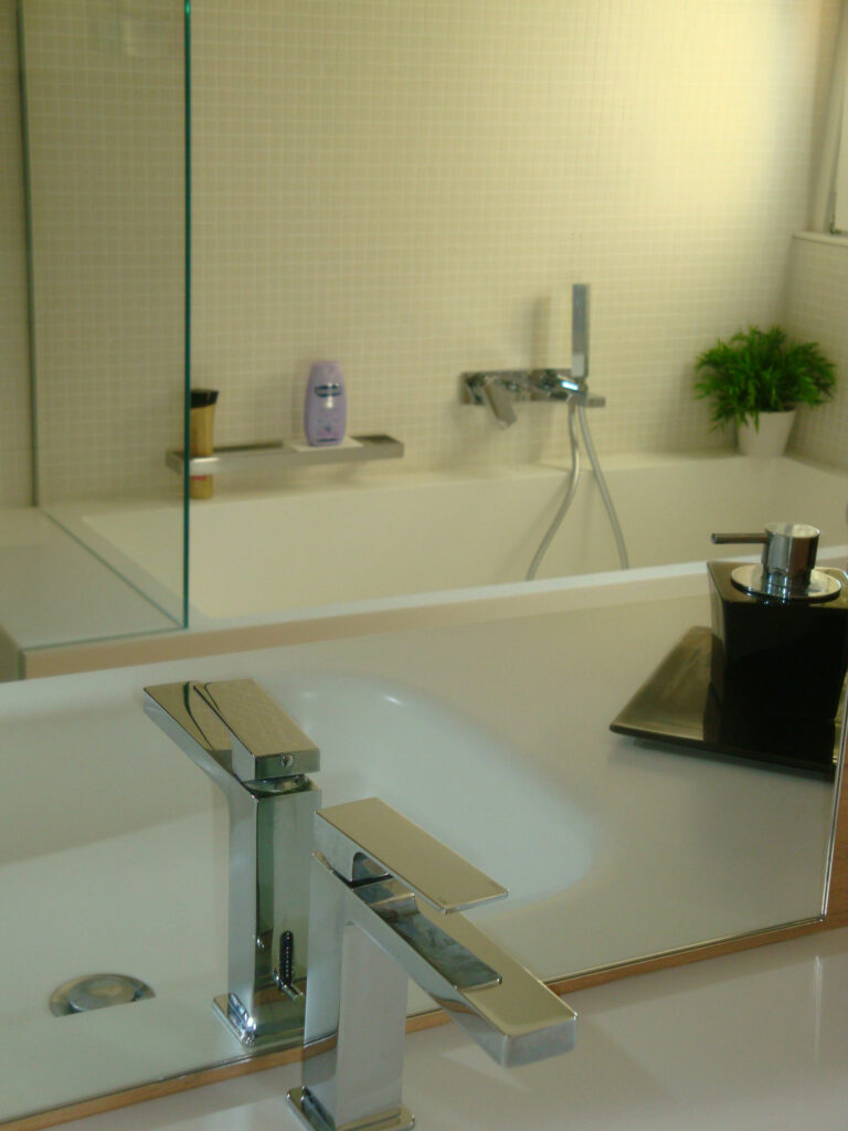 Si tratta della ristrutturazione di un bagno in un appartamento al piano attico ad Ancona. Il corian è il materiale scelto per caratterizzare l’ambiente: con esso sono stati realizzati la doccia saldata con la vasca a formare un corpo unico, il lavello e le mensole della nicchia.