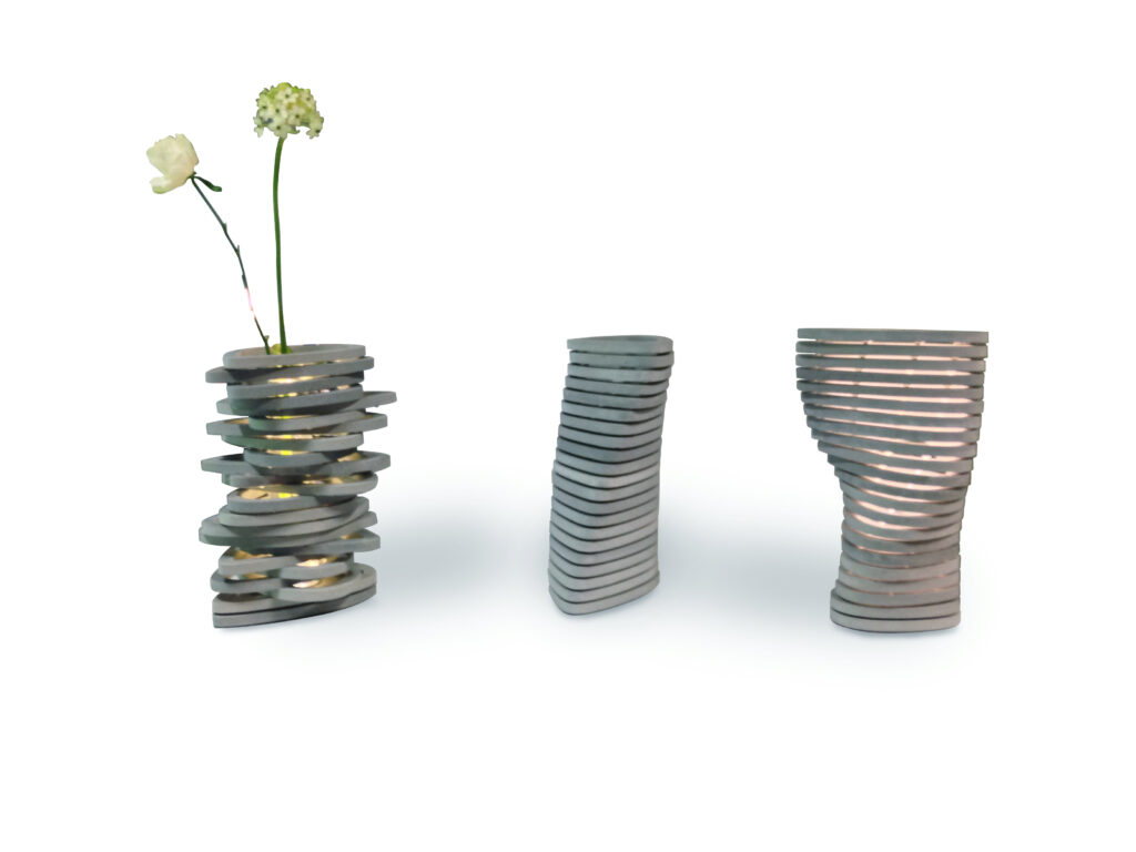 a product composed of multilayered concrete modules. the user can actually configure his vase as he wishes. a LED lamp is located in the base of the object enlighting its structure