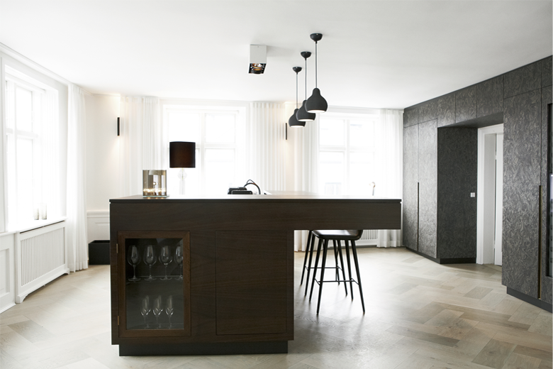 In the autumn of 2011 we finished the complete renovation and interior design of a 135 square meter apartment in the center of Copenhagen. Exclusive bathrooms, master bedroom, guest room, powder room and open space living & dining area. All furniture and fixtures are custom-made, and a first-time black mirror floor!