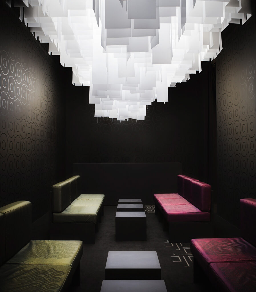 Achieving for highly personal and emotional effect the project suggests the image of a luxurious contemporary environment. Diffused light and the extensive use of decorative carpeting – combined with a long black velvet curtain bounding the interior walls to hide lounge and meeting spaces – provide a general atmosphere similar to a hi-end fashion store. […]