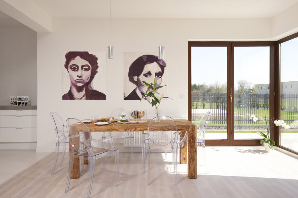 minimalist white house with a collection of modern art