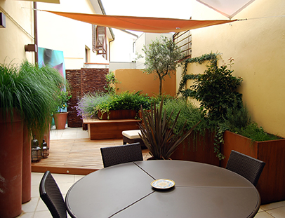 Un rifugio dai rumori della città, un salotto a cielo aperto, un angolo di verde allinterno del costruito. La natura viene domata e sagomata in base alle forme architettoniche: le linee geometriche di legno, salice intrecciato e acciaio corten abbracciano il disordine delle piante, creando un ambiente intimo ed accogliente.