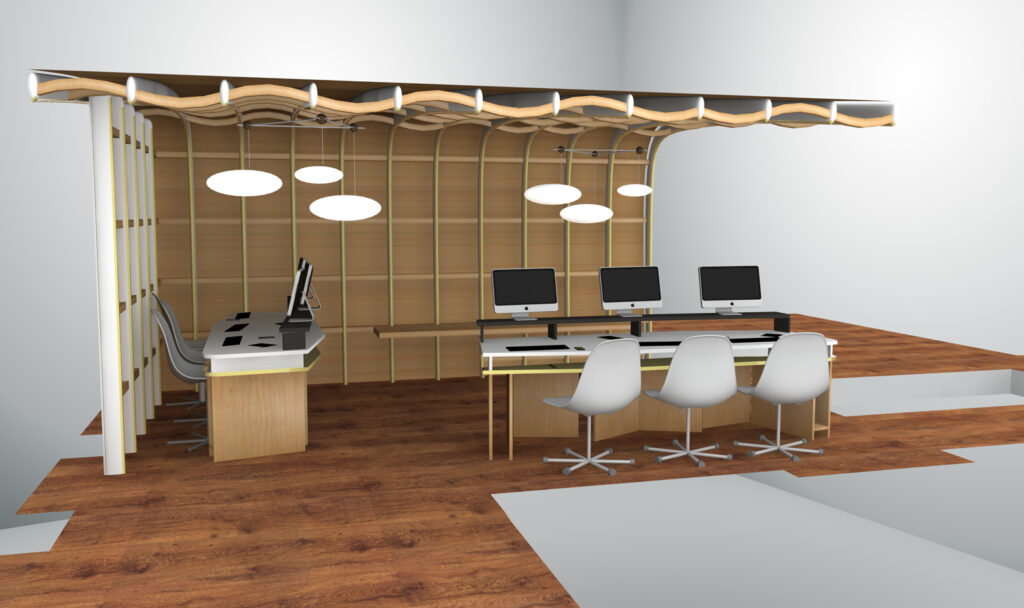 Interior decoration project of an office in Paris, plywood skeleton structure with honeycomb shaped ceiling and library walls including lighting, desks and chairs.