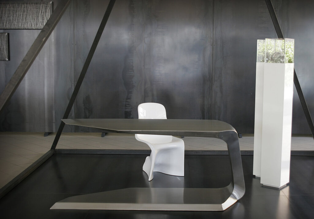 SCRIVANIA IN ACCIAIO INOX SATINATO REALIZZATA INTERAMENTE A MANO, PEZZO UNICO