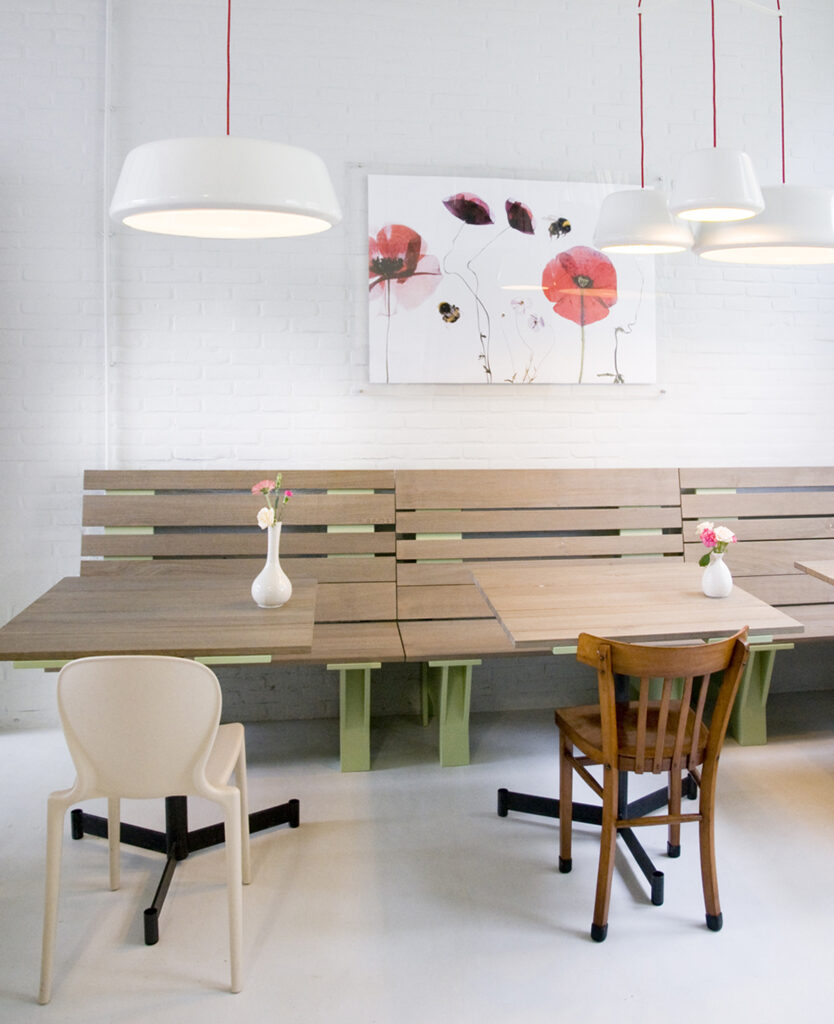 The robust materials and bright colors of the furniture give this brand new, bright and fresh patisserie a very welcoming character.
