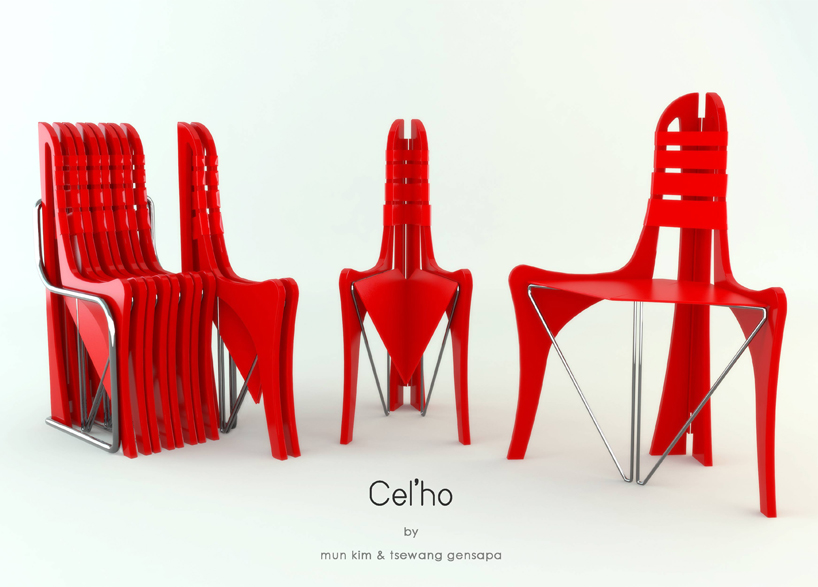 Cel’ho is a set of 5 symmetrical folding chairs that when stacked together become a comfortable lounge chair.
