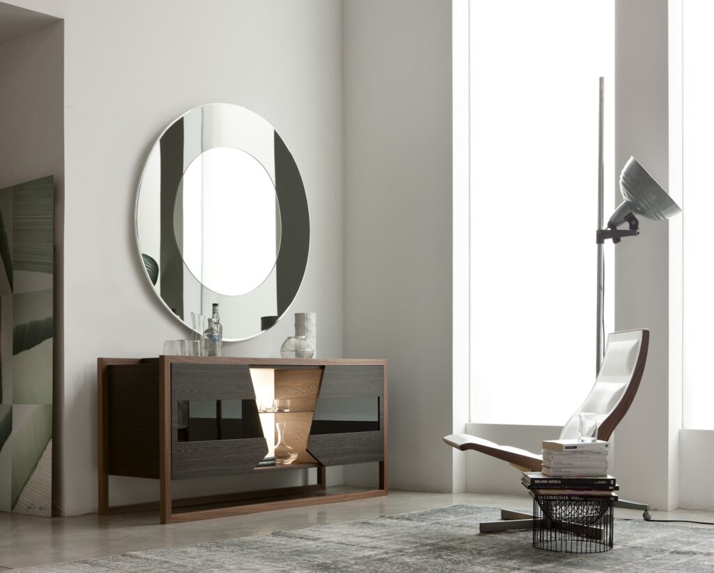 Mobile Bar DRINK Un mobile dal grande impatto visivo che funge prevalentemente da mobile bar è realizzato in rovere affumicato,è munito da ante e vano con mensole in cristallo e 2 vassoi posti nella parte superiore ,inoltre ha incorporato una luce a led che illumina la parte centrale rendendolo un punto luminoso allinterno della casa […]