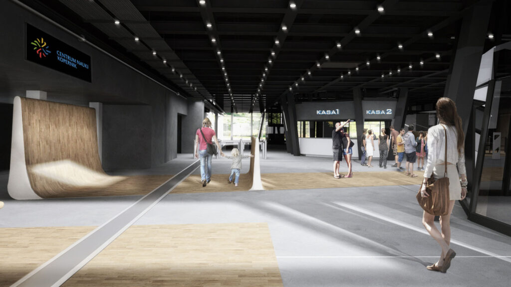 Conceptual project for designing the main entrance to Copernicus Science Centre in Warsaw as well as the main entrance to Planetarium. Innovative character is created by organic wooden forms, buildings and structures in ceiling, floors and walls in the entrance space of the Museum.
