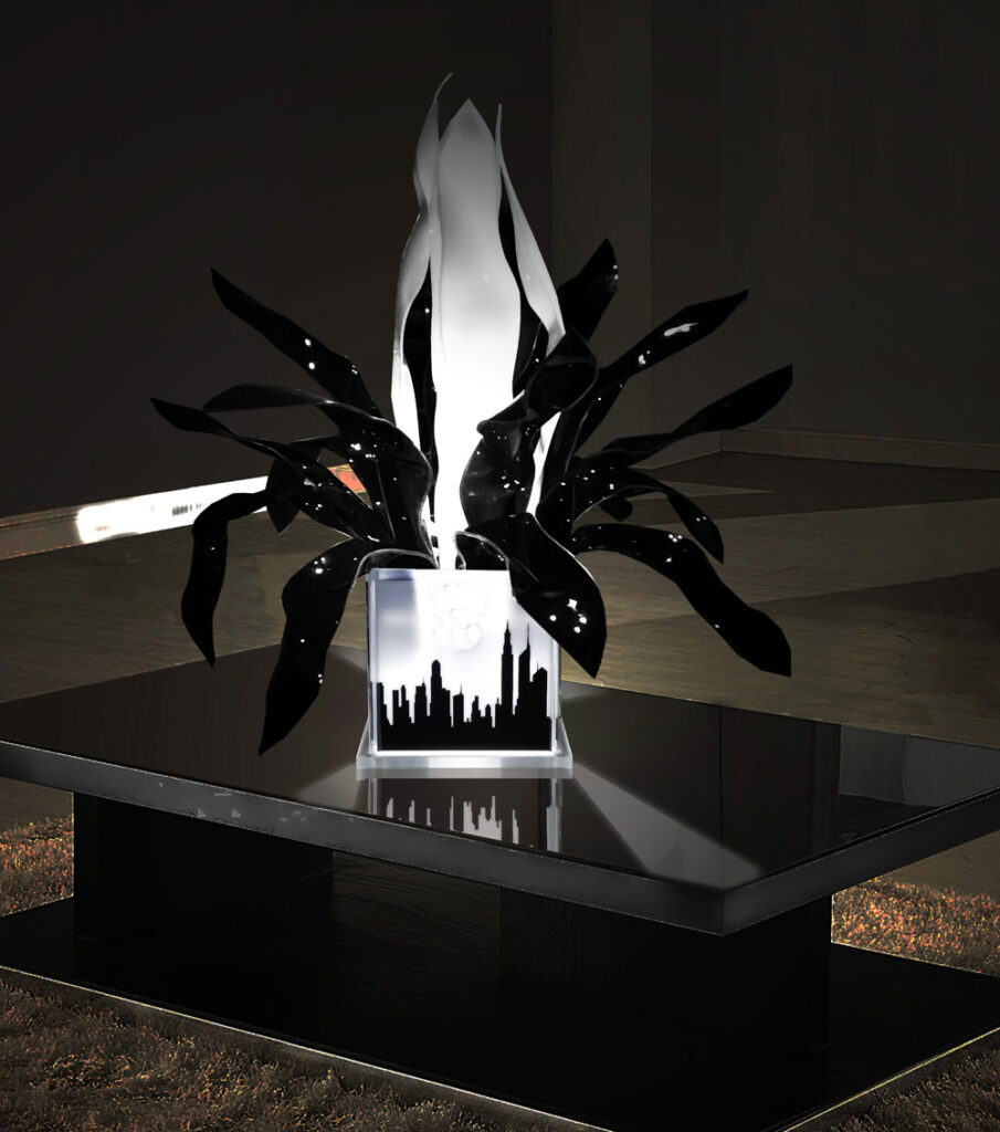 Lampada da tavolo realizzata completamente in plexiglass modellato a mano. La particolare inclinazione delle foglie permette di illuminare uniformemente anche la base sottostante. Questa caratteristica rende questa lampada una vera e proprio scultura luminosa.