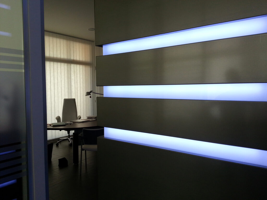 Un pilastro dalle dimensioni importanti, in unampia zona ufficio allinterno di uno studio di consulenza, da ostacolo alla fruizione dello spazio si trasforma in oggetto luminoso dal design accattivante caratterizzando tutto lambiente.