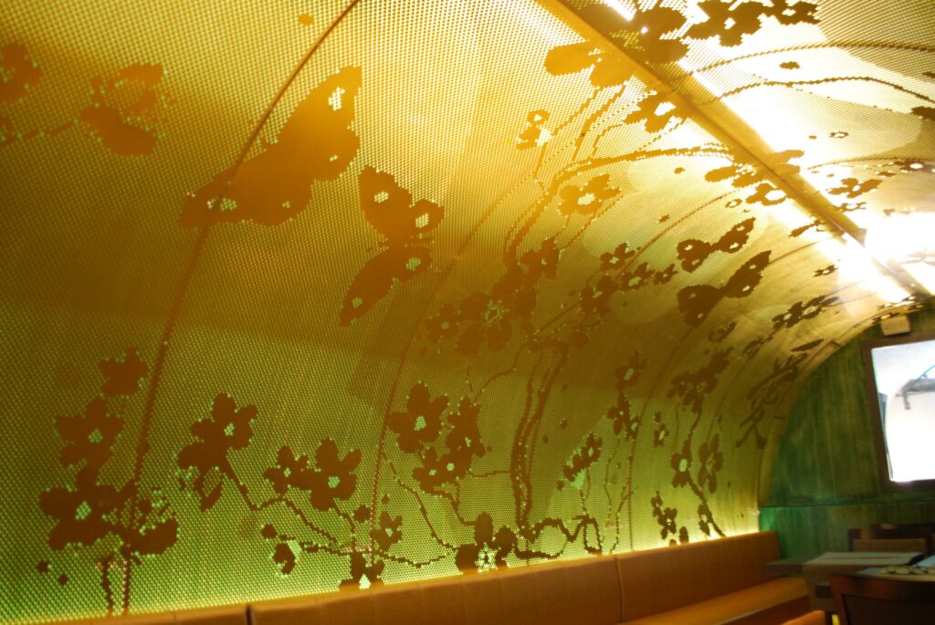 Rivestimento di una volta di un ristorante con lamiera forata di design, lamiera in ottone spessa 1 mm con foratura di varie dimensioni cosi da creare un’effetto ottico pazzesco. per info 340 8662119 oppure su info@me-des.it